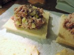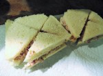 Mix together by tossing and stirring until everything is mixed well. Cut the crusts off of your favorite white sandwich bread. Spread slices with the deviled ham and cover with another slice of bread. Cut sandwiches into quarters and poke a decorative toothpick through to hold them together. Serve with whatever was leftover on the relish tray (carrot sticks, cream cheese stuffed celery sticks, green and black olives, deviled eggs, spicy pickled okra, spicy pickled jardinière mix, pickled asparagus, dilled green beans, little dill and sweet pickles, etc.), chips, or whatever you have. These go great with cheddar cheese soup. Check out my recipe in my blog post “Soups On.” (<<< click link)