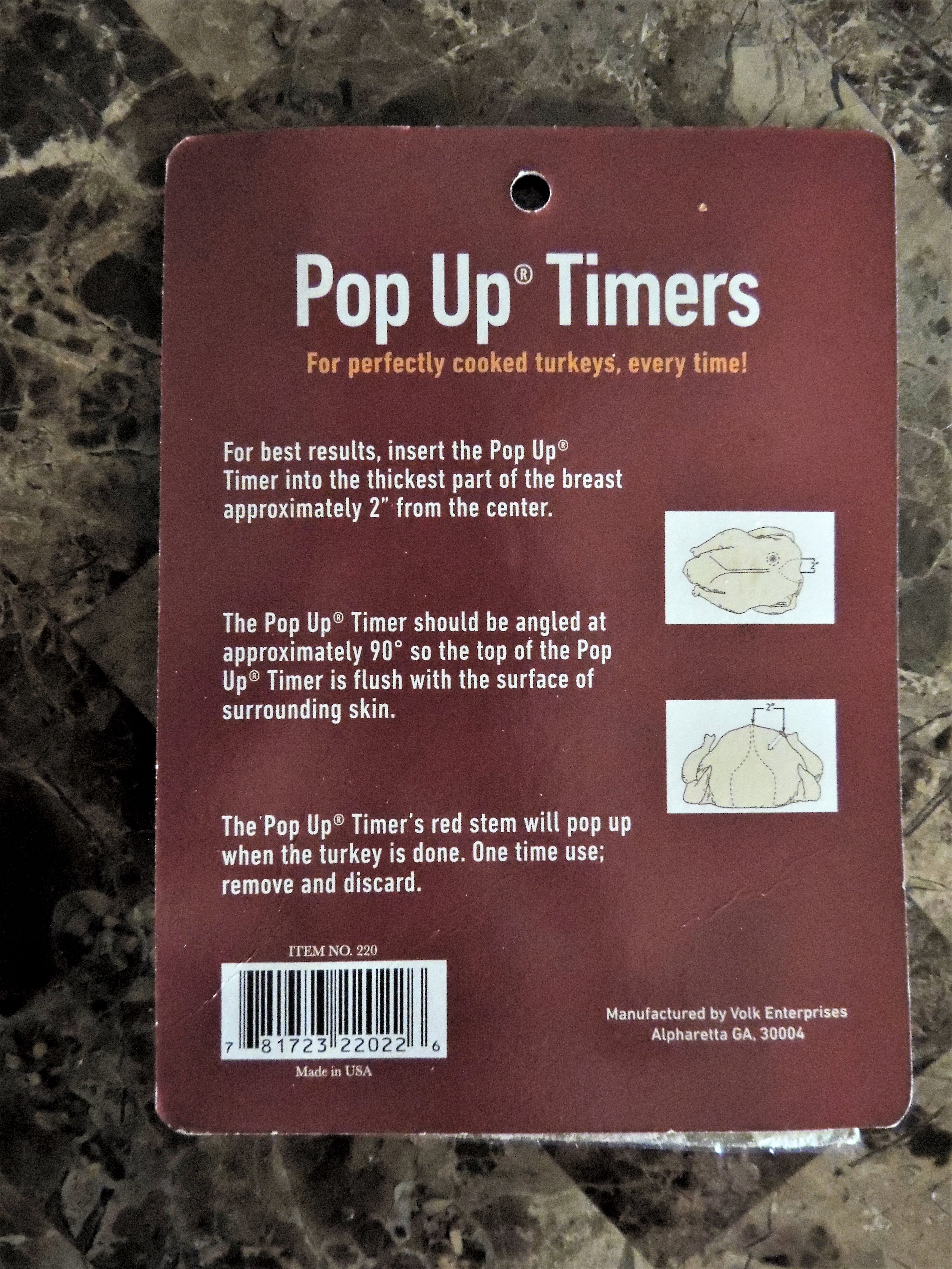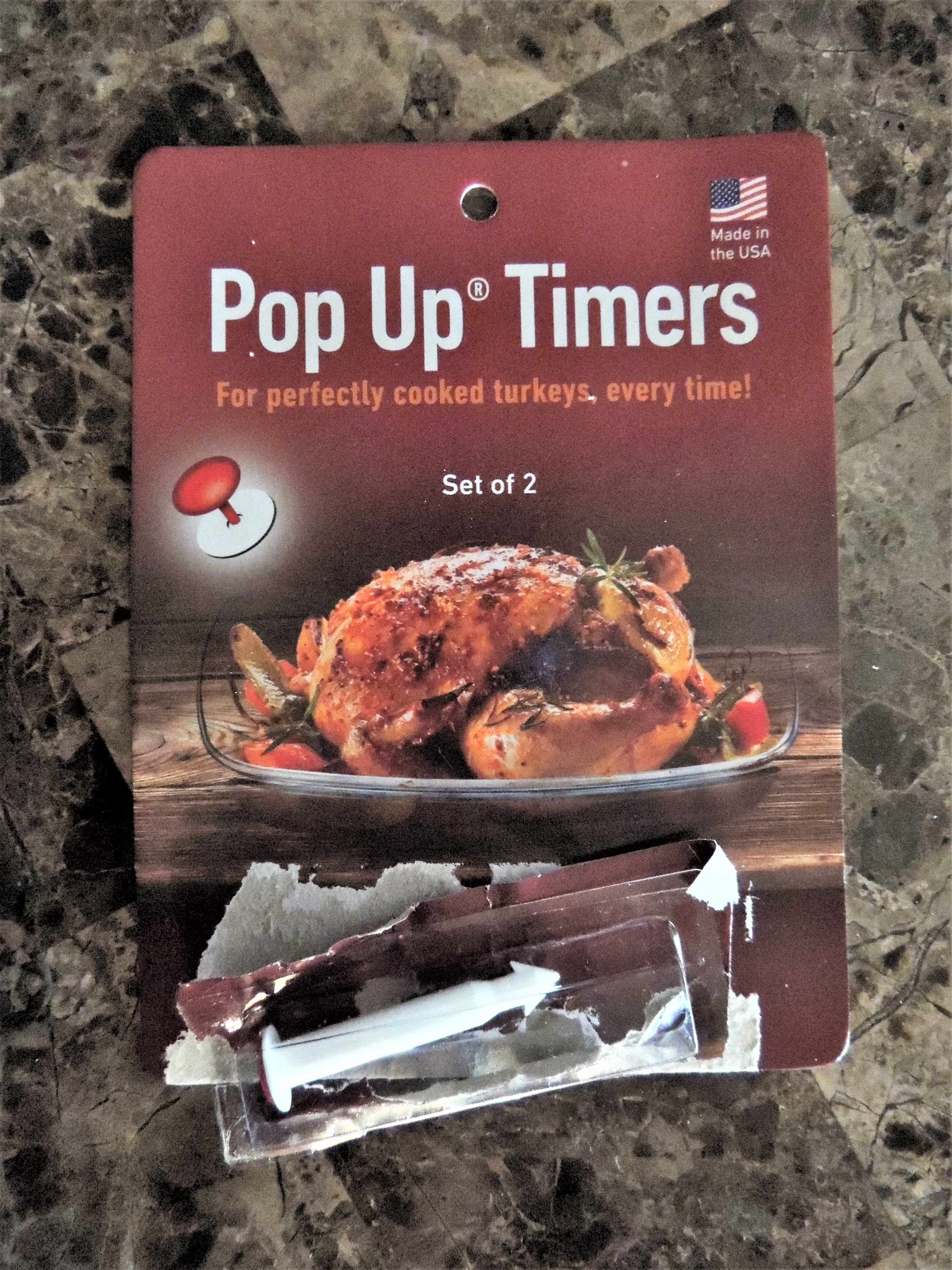 By 9:15 AM it was all dolled up and ready to go into my preheated (450*) oven. I layed a piece of foil over the top (not totally covering and not sealed) and added 4 cups of water to the roasting pan, closed the oven door, and then turned the temp down to 350*F and set my timer for two hours, so I could start peeking in on my pop-up thermometer frequently at that point. (It actually took my bird almost 3 hours to cook).