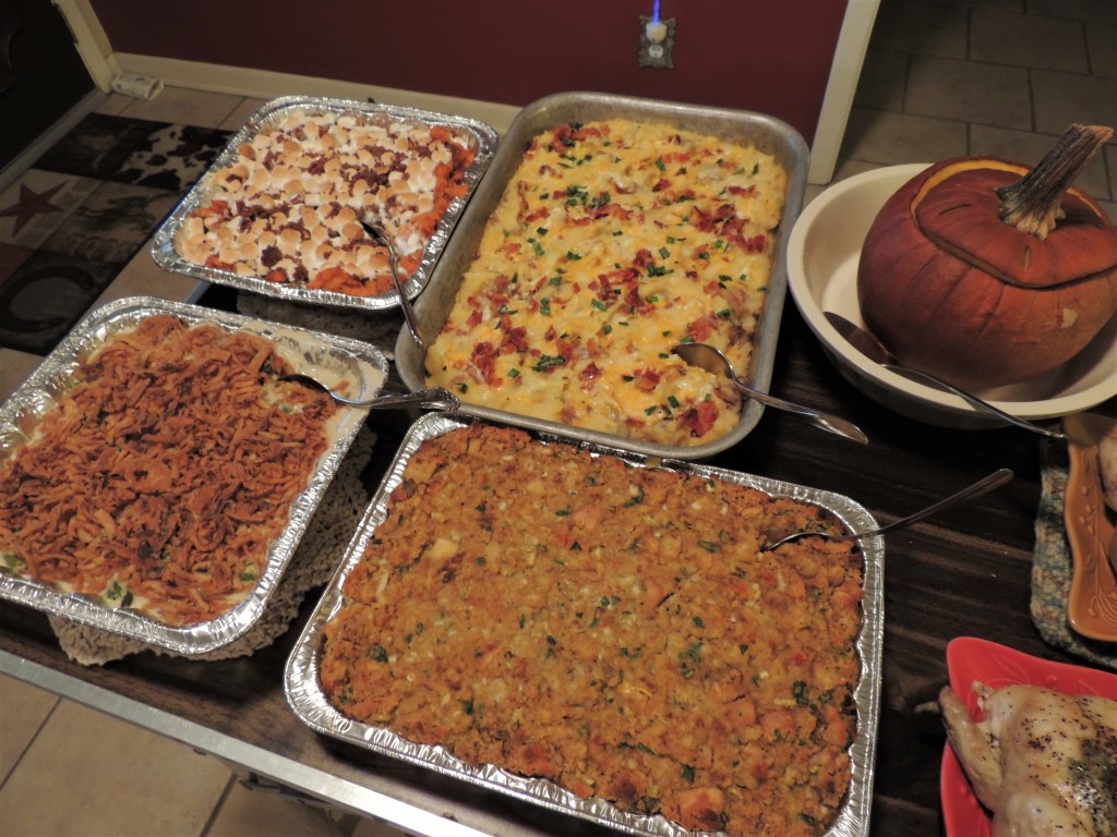 Some years I make a loaded potato casserole which is skin-on mashed red or yukon gold potatoes with a little chicken broth, salt, pepper, garlic powder, butter, and sour cream or ranch dressing stirred in. Sprinkled on top with cheese, bacon crumbles, and chopped green onion, and then baked in a 350 degree F oven until hot and bubbly.