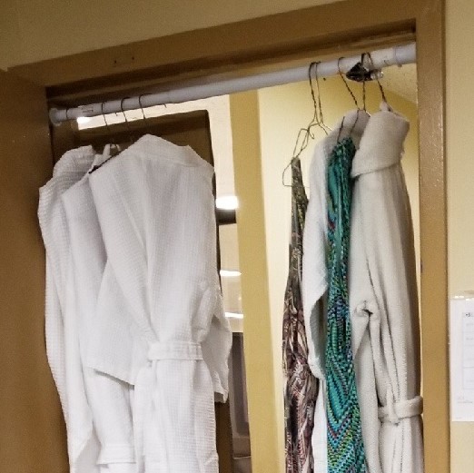 I used an inexpensive shower curtain rod (purchased from Walmart for about $5) to hang some long robes and long dresses on. Beings this is south Texas nobody had long coats we could use, and I wasn’t sure how much weight that rod would hold either. Anyway, as soon as the kids opened the wardrobe doors, all they saw was a closet full of clothing which they had to walk through.