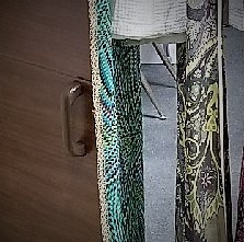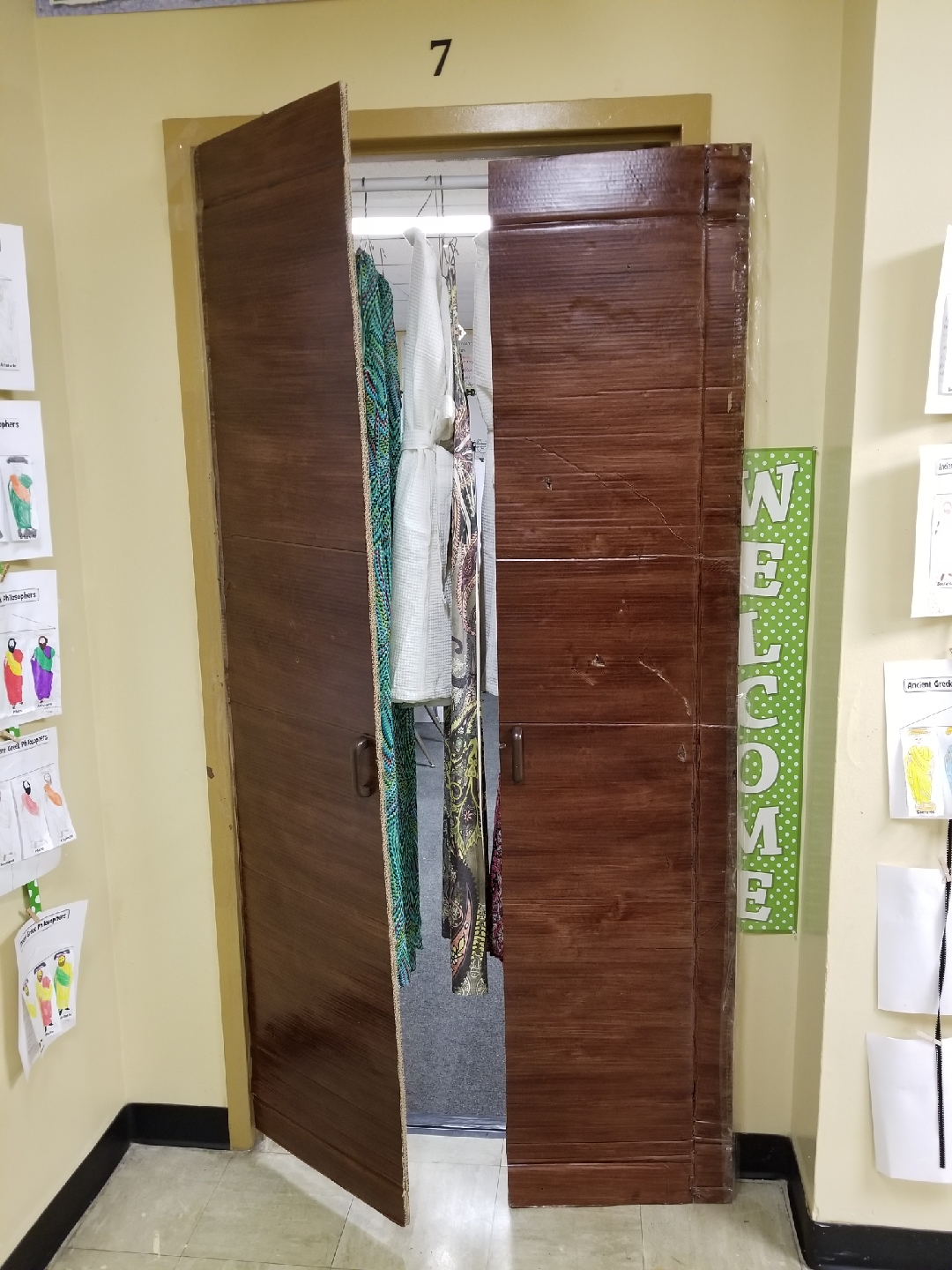 I made a fairly crude set of wardrobe doors to decorate the classroom door entrance, out of a large cardboard box (I think it came from a furniture store). I measured the classroom door and then cut the cardboard to fit using a square and a utility knife. Then I painted the cardboard with some mahogany colored varnish I had leftover from a furniture refinishing project I did a while back. I let the cardboard dry for about a week and then I cut the doors in half lengthwise. I didn’t have a lot of time to make these doors, otherwise I would have put a lot more thoughtful detail into them, but at least I gave them handles.