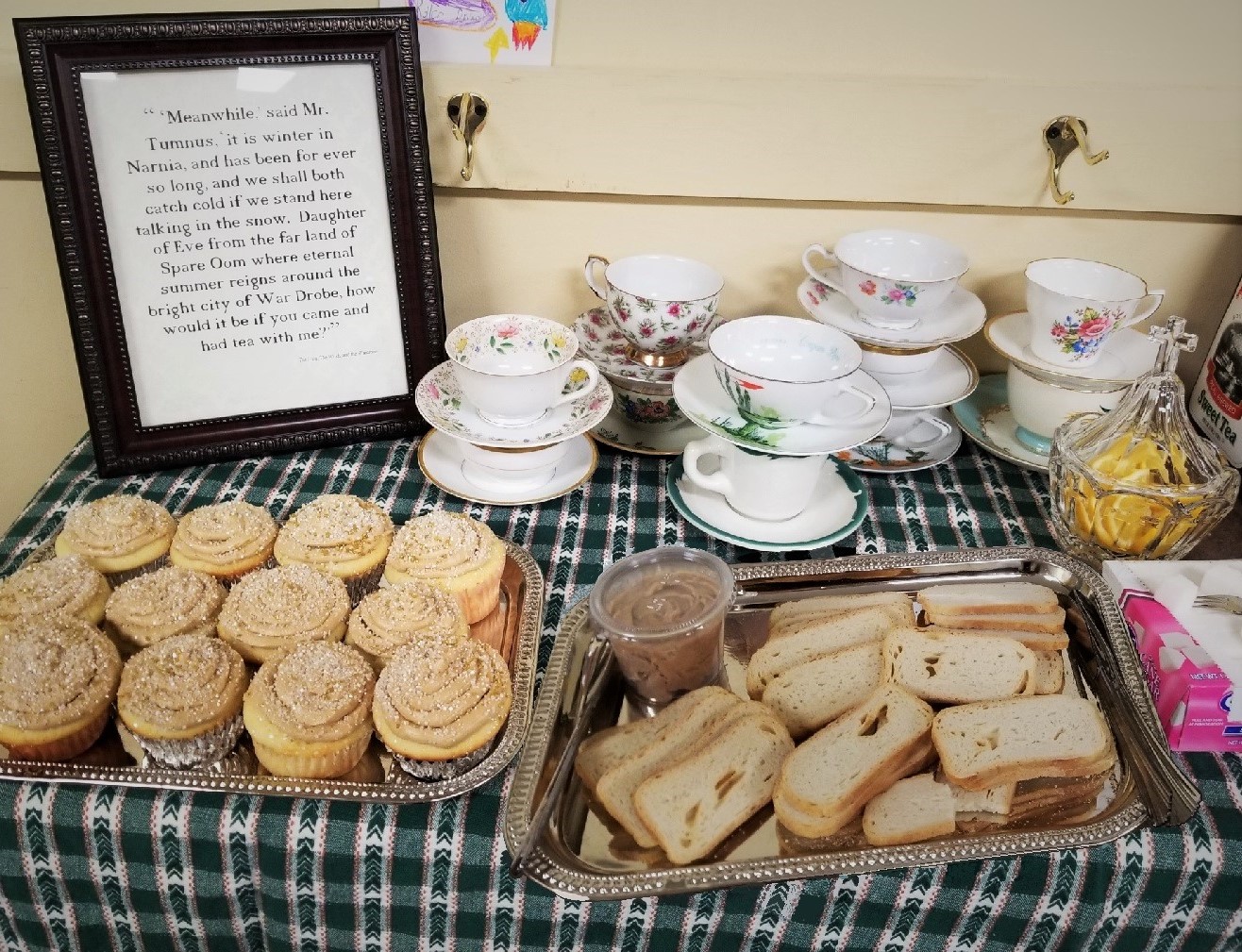 Finally was Mr. Tumnus and Lucy’s Tea Party table. I set this table with real teacups, and a spread of “sugar topped cupcakes” and TOAST with honey butter. I brewed a big pot of tea and set out sugar cubes and lemon slices so the kids could doll up their cups as they wished.