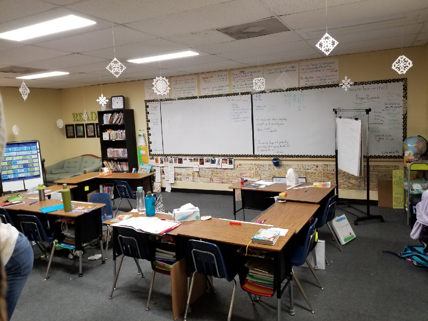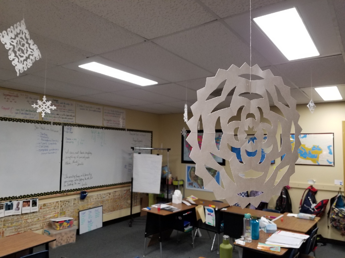Once inside it was a winter wonderland. I had cut out about 25 paper snowflakes and hung them to the ceiling with string and push pins, all over the classroom.