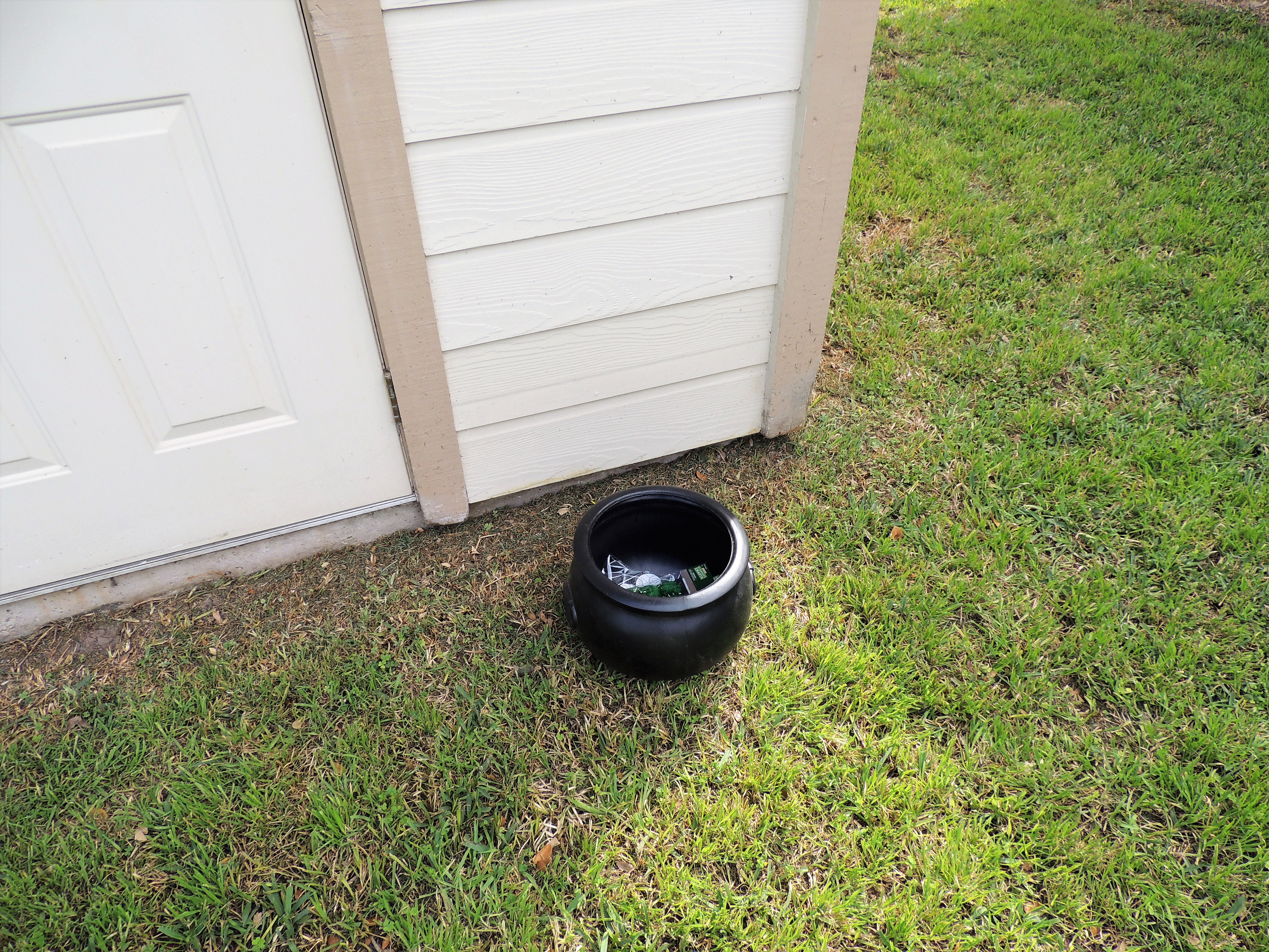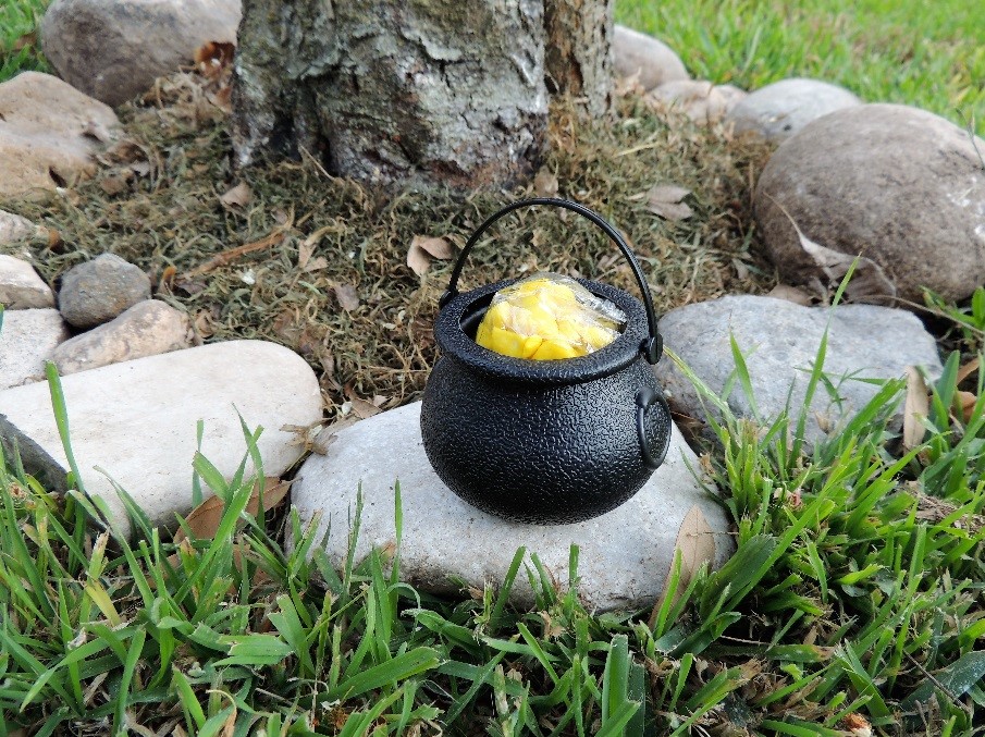 But, to our utter delight, our sweet little guy must have appreciated the clover in our yard, or the glitter we sprinkled all over, or perhaps felt sorry for us for our shabby looking traps, because there were little presents under each box. The leprechauns must have left them. Each had a small black kettle filled with either gold nuggets gum, or gold foil covered chocolate coins. We gathered up all the little gifts and as we were walking back to the house, we spotted a big black kettle by the well house with even more little surprises inside. The girls squealed! How awesome was this? Our sweet little leprechaun had left the girls some fun little craft projects to do, along with some hair ties, and candy necklaces. He must have liked their giggles as he spied us setting those traps.