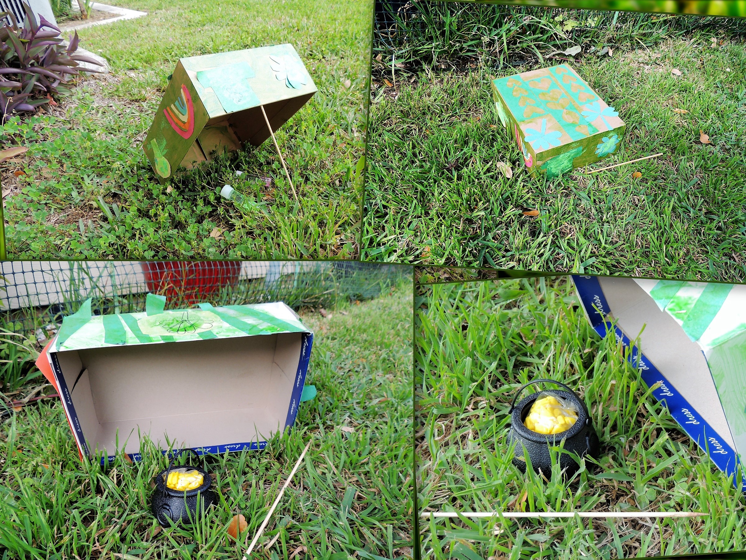 To pass the time we decided to watch a movie and give the leprechauns some time to be lured to our traps. About halfway through the movie we checked outside the window and found one of our traps had been sprung (thanks to grandpa who was secretly in on the charade ;)). Oh how exciting!!! The girls and I could barely get outside fast enough, and when we did we found all four of our traps were sprung. We were a little bit nervous at first to lift the boxes, sure that one of the little guys would dash out and maybe kick us or try to bite us as they ran away. But we mustered some bravado and carefully lifted each box (in retrospect a person standing back with a fishing net would have been good for effect) hoping to have caught a leprechaun, but darnit, not a one. Shucky darns!!!