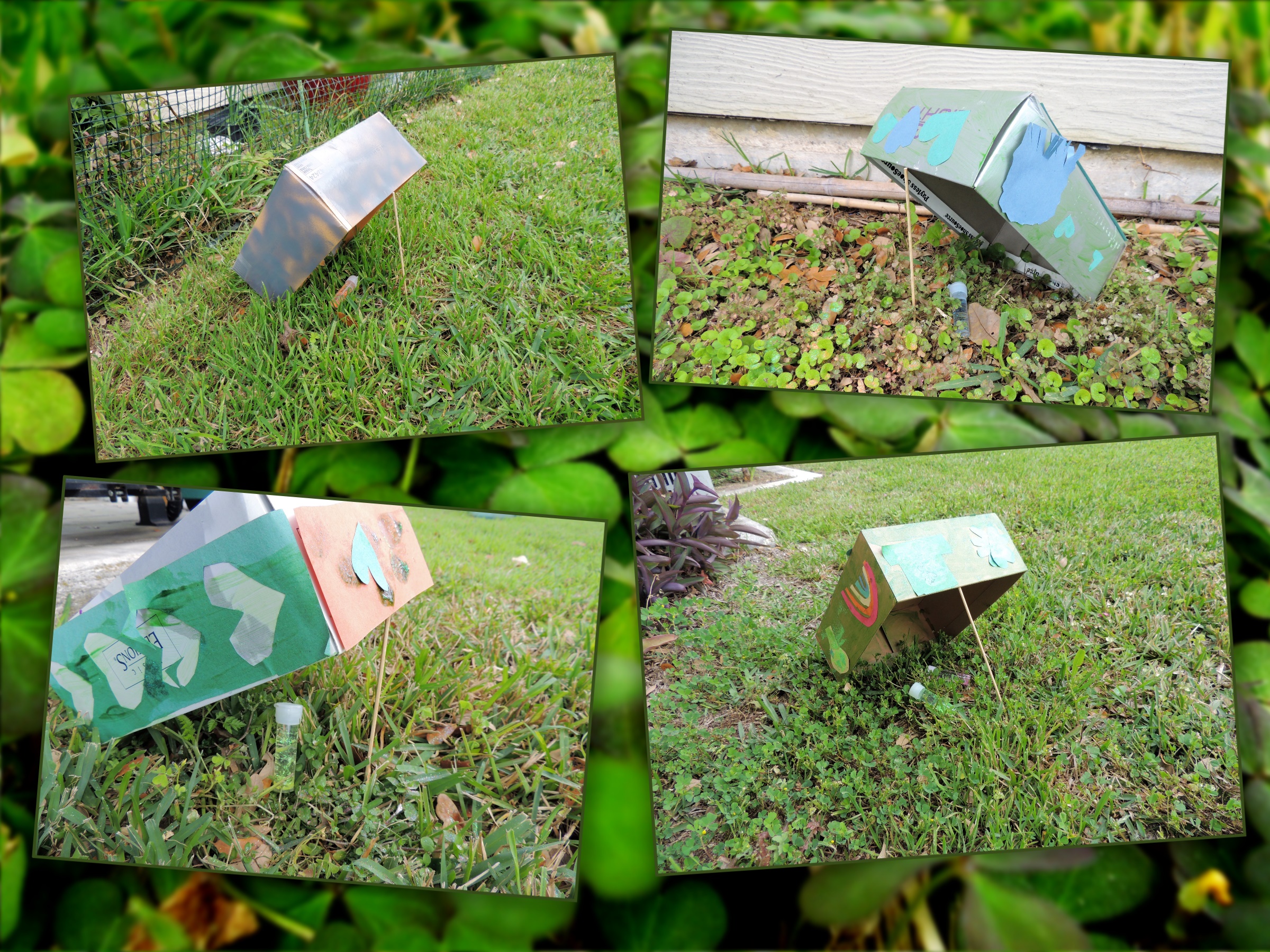 …And then the girls and I sat down to make our Leprechaun traps. We used some old shoe boxes I found out in my garage, plus some construction paper, glitter paint, and wooden kabob skewers. We sure could have made them a whole LOT cuter, but we were in a bit of a hurry, anxious to hopefully catch one of these little creatures. So once the girls had hastily constructed two traps each, we were ready to go find some good places in the yard to set them up, hopefully some places with clusters of lush, green clover.