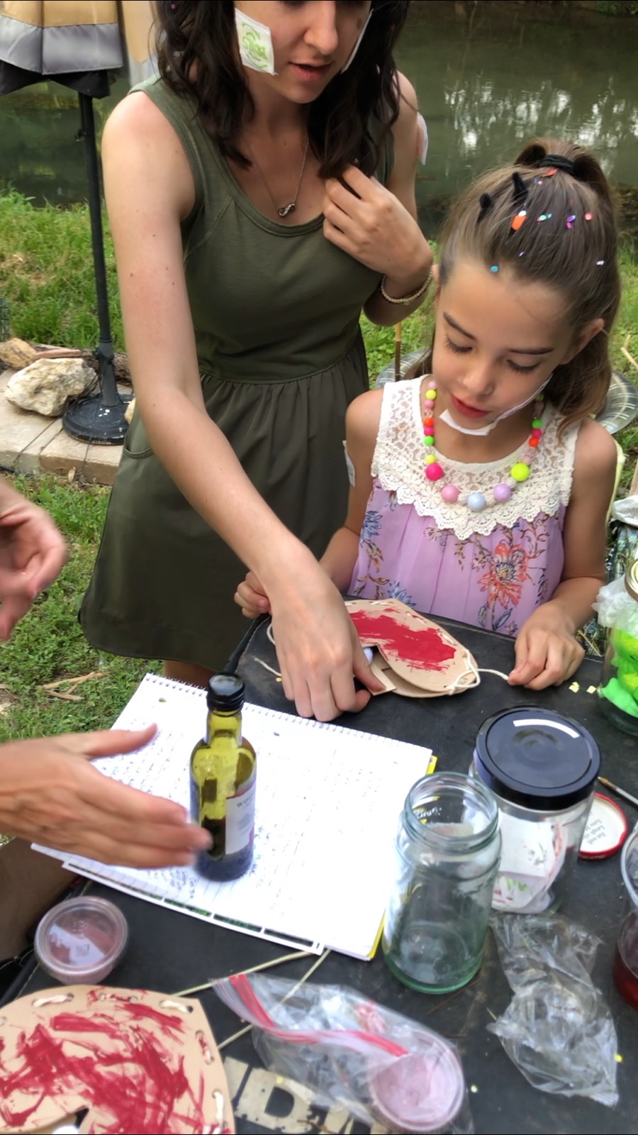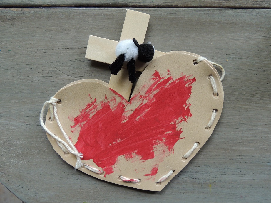 I then gave each girl two hearts cut from foam board that I had punched holes in all around the edge. I gave them each a needle and thread so they could stitch the two pieces together to make a pocket. As they stitched I explained that we all have to prepare our hearts to receive Jesus (which means we have to turn from our sinful nature and open our hearts up to Him). Once their hearts were sewn together I gave the girls red paint, representing the blood of the lamb, and we used a clump of weeds to paint the “blood” on their hearts. And then we asked Jesus to come into our hearts – which was represented by placing the lamb-crosses inside the pockets of the hearts they made and painted.