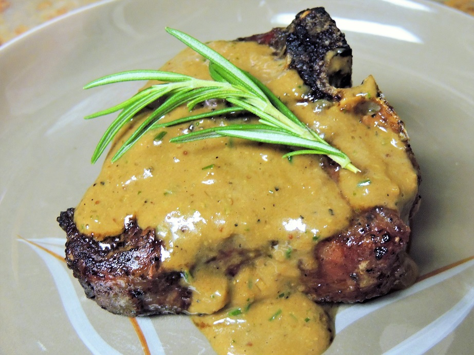 Separate charcoals and sprinkle with wood chips. As soon as they begin to smoke, place chops on grill about 6 inches above heat and close the lid. Let them grill undisturbed for about 4 or 5 minutes. Lift the lid and flip the chops over to the other side. Close the lid and let grill for another 4 or 5 minutes. Lift the lid and check the internal temp of each chop. Continue flipping and cooking until each chop reaches an internal temp of 135 degrees (medium rare). Don’t eyeball it – use a thermometer for perfect results. The moment they reach temp, remove them from the grill, placing them on a dish. Let them rest for a minute or two, then drizzle each with sauce and serve with a sprig of Rosemary for garnish.