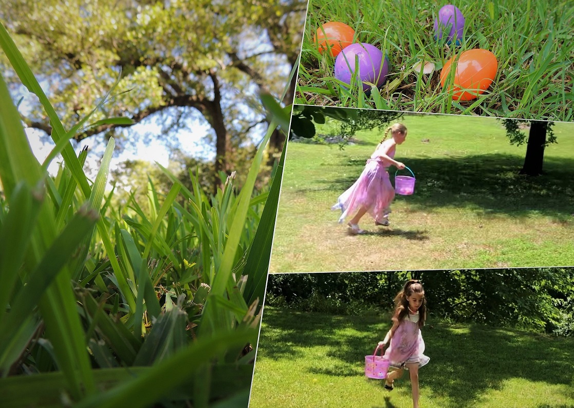 This year’s egg hunt mostly consisted of plastic eggs strewn all over in the yard, all the way around the house. A few were perched in the limbs of the trees and some other slightly more difficult hidey spots. As per grand-daughter’s request I hid special GOLDEN eggs (1 per kid) in the more difficult places. They got to redeem those for one special prize each – their Easter Baskets! I put a little note inside each golden egg which told the kids where to look for their “special surprises.” The special Easter Baskets were filled with a few candies, some little toys, jewelry, Knick knacky things, and a pretty journal and fancy pen for each girl, which they’ll get to use as journals all summer.