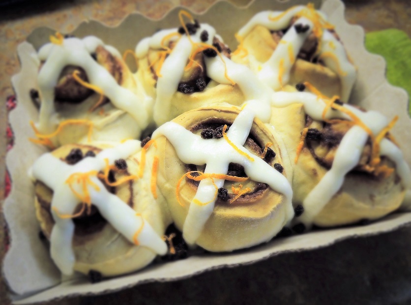 This year I cheated and purchased frozen cinnamon rolls, and added the currants and some orange zest as a garnish after icing.