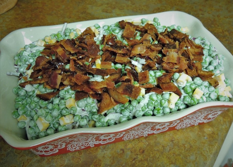 Mix together the sauce ingredients and carefully stir them into the thawed peas. Add the red onion and cheese and carefully incorporate. Taste to make sure there is enough salt and pepper. Place in serving dish and top with bacon for garnish.