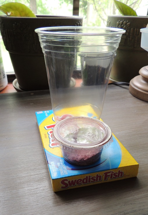 The first plague was to turn the Nile River into blood: I poured water into a glass for each kid and added red drink powder to it. Then we tossed in some Swedish Fish to represent the fish that died. Then I asked, “Pharaoh, Pharaoh, will you let my people go!” – and I pointed to the kids to say, “NO, NO, NO!!!”