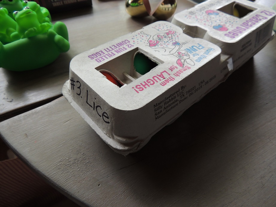 So God sent a third plague – Lice: I used confetti eggs, called Cascarones here in south Texas, and divided two dozen of them between each of us and we all got to break them on each other’s heads. This always causes lots of laughing. Then I said – “Pharaoh, Pharaoh, will you let my people go!” but Pharaoh said (and I pointed to the children who said), “NO, NO, NO!!!”