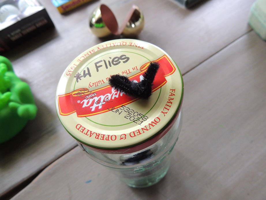 So God sent a fourth plague – Flies: I used black pipe cleaners, cut into about 4” pieces and twisted them into wings and a body shape and I filled a glass jar full of them. I took the lid off this jar and dumped the flies in the kids’ hands and let them put them on us grown-ups, in our hair, down our shirts, etc. They then had fun picking them up off the ground and tossing them around some more. Then I said – “Pharaoh, Pharaoh, will you let my people go!” but Pharaoh said (and the kids yelled), “NO, NO, NO!!!”