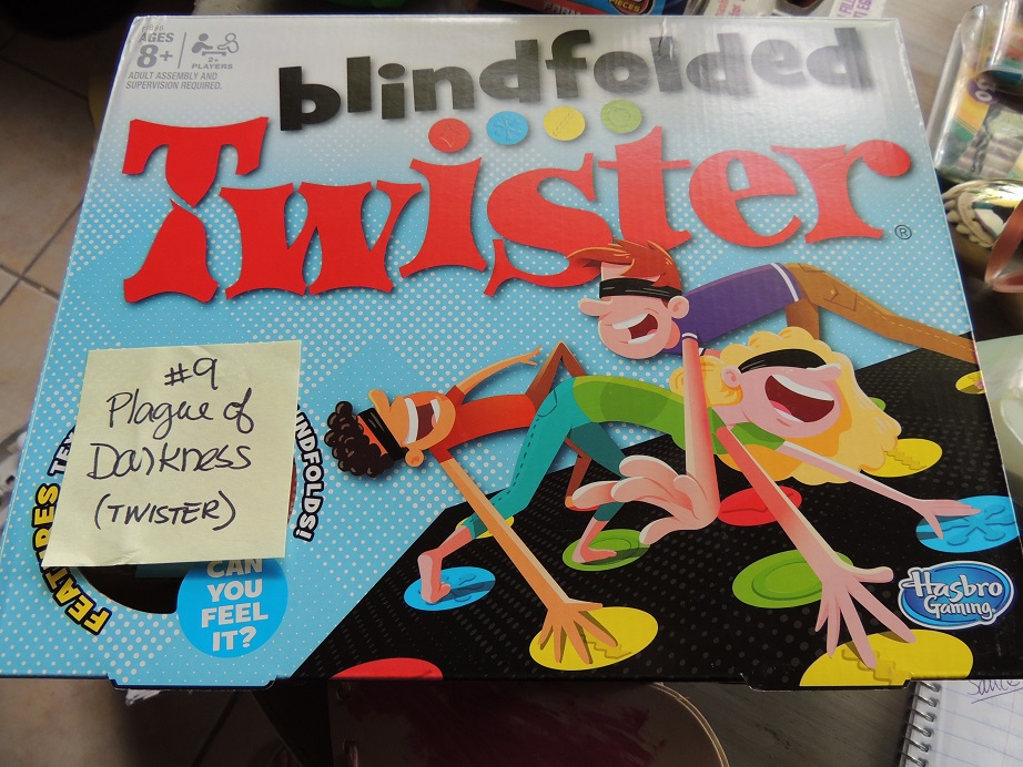So God sent a ninth plague – darkness: For this one I had purchased a game of Blindfolded Twister. It wasn’t a good thing to play outside, where we were at the time, so I improvised and had the kids cover their eyes and try to find mommy, then daddy, then grandpa, then grandma, then sister. (We did play the Twister game later, in the house and it was perfect). Then I said – “Pharaoh, Pharaoh, will you let my people go!” but Pharaoh said … “NO, NO, NO!!!”