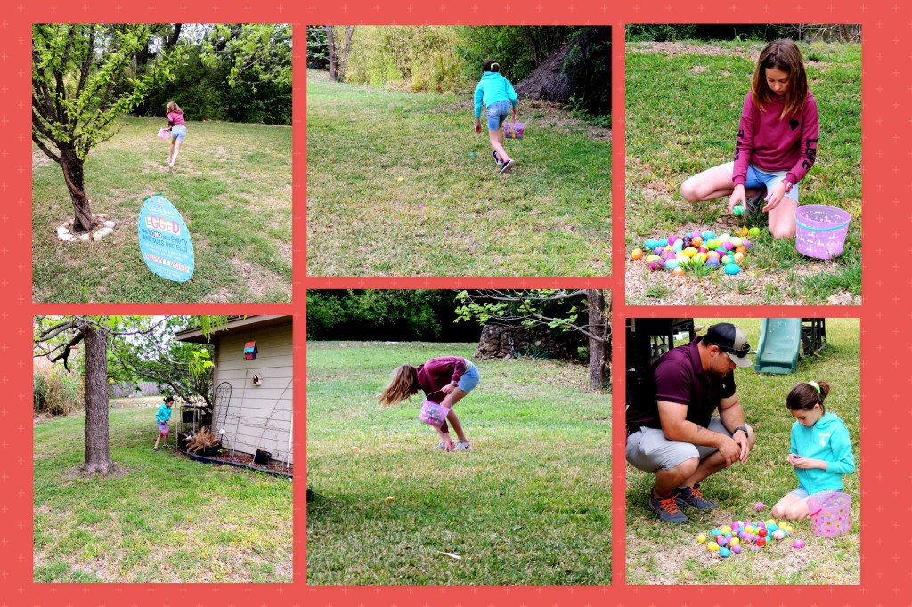 But at this point we pushed the pause button on the hunt so we could partake of our feast. All our tummies were growling. The girls left their buckets and eggs lie, and we all washed up. I swiftly set our hot dishes on the table and asked Jo to set out napkins and silverware for everyone. We all sat down, bowed our heads, and thanked our precious Jesus for giving His life for us, and for blessing our fellowship this beautiful day.