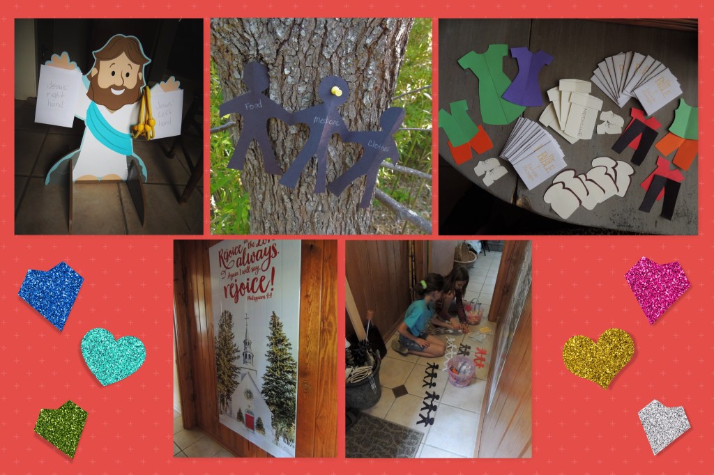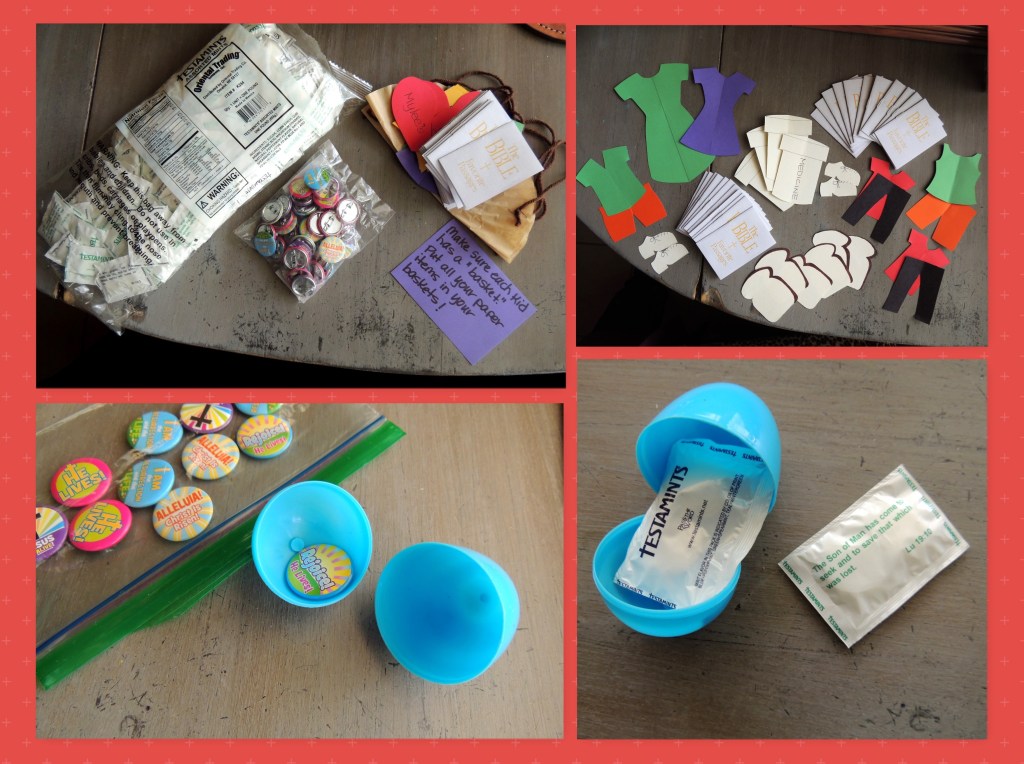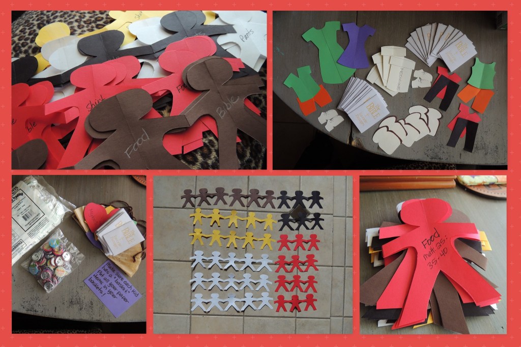 • Make paper items: Need various colors of construction paper. Cut out the shapes of one heart for each child, shirts, dresses, pants, medicine, food, etc. and also include the tiny Bibles. You’ll need enough paper items for each paper doll (see diagram above) to have one item. On each heart write a child’s name so that if one kid finds both hearts they can give it to the one that it belongs to. Write the scriptures on the back of each heart.