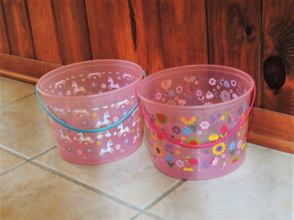 • I already had a bunch of plastic Easter eggs that I keep in a plastic tub and use from year to year, but if you don’t have any, you’ll need to purchase those – about 40 per child, various sizes and colors. And if you want to fill yours with goodies (other than mints and buttons), go grab that stuff as well.