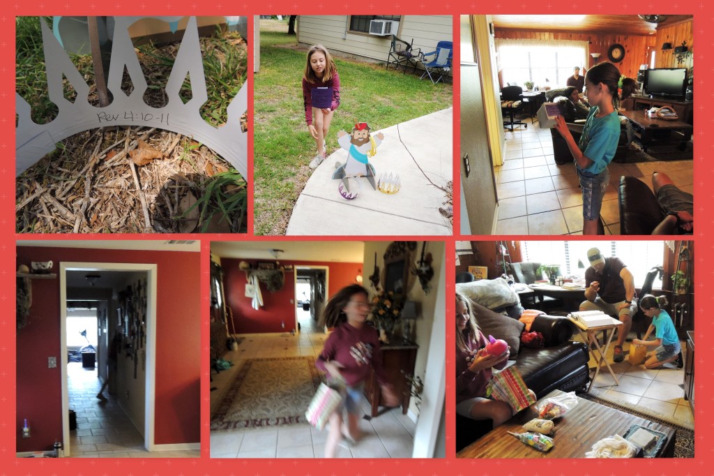 The girls tore off in that direction, with granny hot on their heels. Lol, no, I was nowhere near their heels. I was miles behind them panting and yelling for them to wait for me as I hobbled at top granny speed. Ha! I could hear them screaming in the distance, “We found Him! We found Him! We found Jesus! I got there just in time to snap a photo of them reading the note from Jesus’ right hand. It said: Read John 21:12-17/Matthew 25:31-40 …