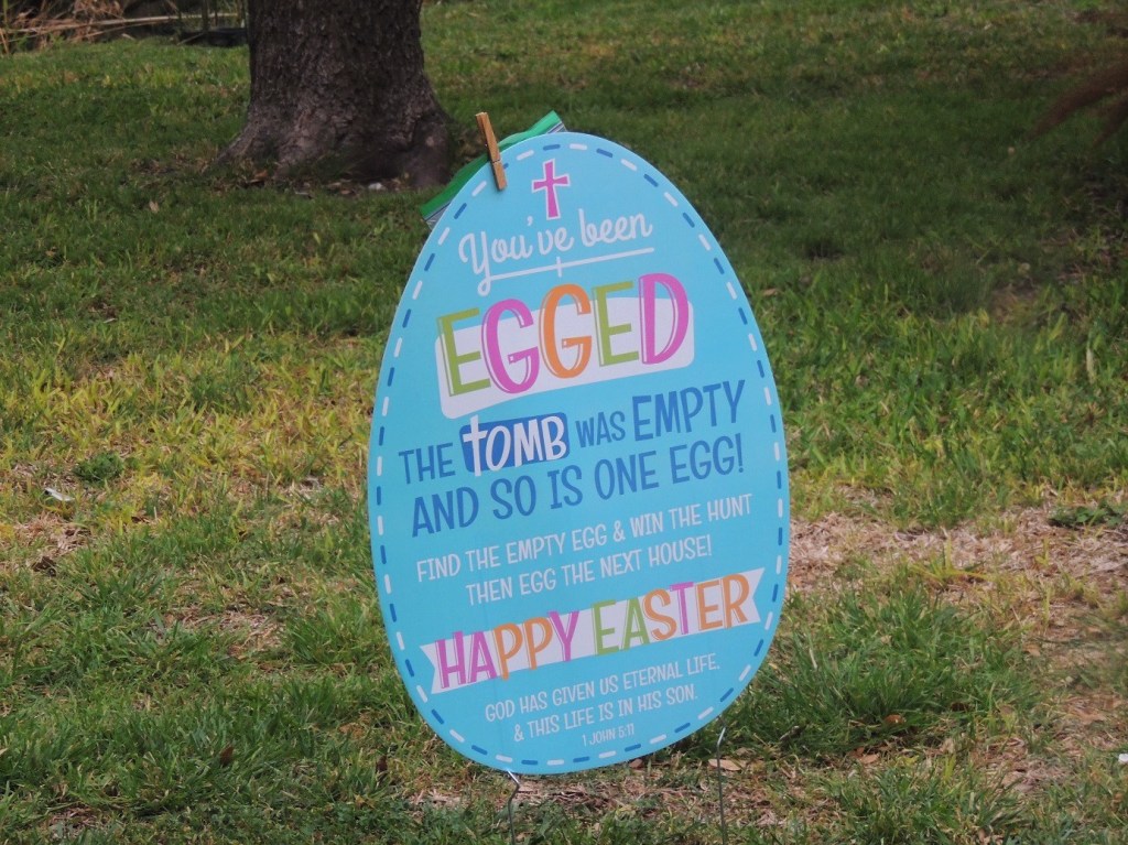 When I heard the car doors closing out front, I ran to greet them at the door, and welcomed all their super-tight, I’ve-missed-you-sooooo-much grandma hugs and kisses. “Are you ready for some fun?” I asked. Oh yes, for sure, they seemed just as excited as I was. So, I led them through the house to where I had their plastic buckets waiting for them by the back door. As we arrived there I pointed to my wall hanging and asked them if they liked my pretty “CHURCH.” I wanted to make sure they saw it. I think they liked it, but honestly they were so distracted with hunting for eggs I was slightly worried that they were going to miss an important clue. Oh well. I supposed that if I had to help trigger their memory later that would be fine. We stepped outside the door to gasps and squeals as they caught glimpses of all the colorful eggs strewn to kingdom come all over the lawn. There in front of them was the lawn sign that said, “You’ve been egged…”