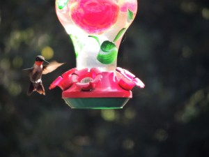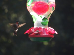 I held my cup away from me, elbows perched on the table, and watched as my graceful guest took a quick flutter over the garden and then buzzed by my flower pots. I had two of them hanging on hooks on the porch and they were filled with some kind of succulent with red blossoms. Yes, I suppose that is what attracted her. In just a moment though she had lost interest in my vegetation, turned on her wings, kicked her engine into hyper-drive, and sped on a beeline off into the vast blue sky. “Come back! Come back! I wanted to say. “I’ll get them!” But it was too late. She was gone. Perhaps someone down the road has their feeders out for her.