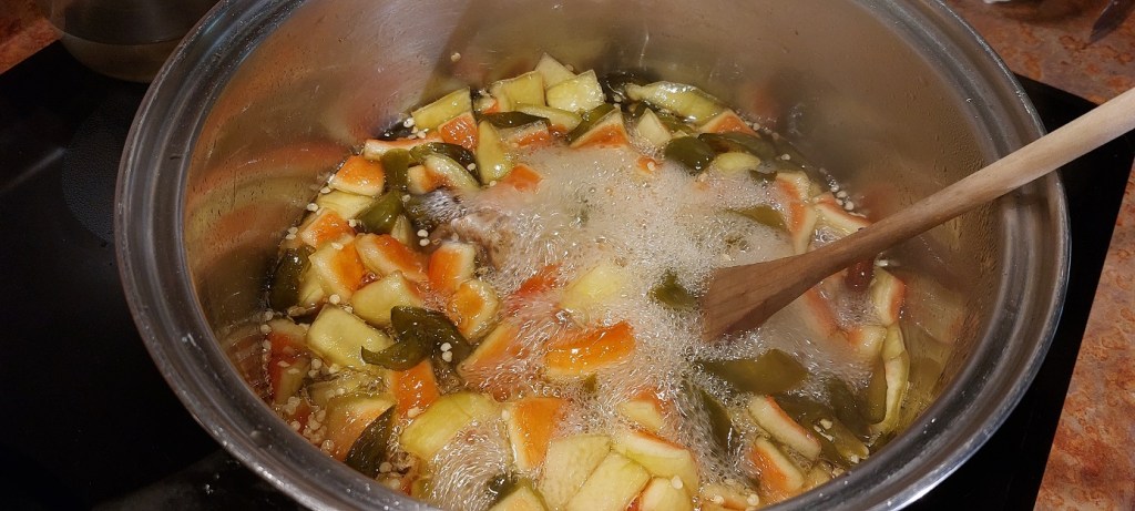 8.  Pour the liquid and rinds into a large pot and bring to a boil on the stove.  (I added about a dozen small, really spicy jalapenos from my garden (stems removed, chopped up), plus one lemon sliced, two cinnamon sticks, and about a heaping tablespoon of Ball Pickling Spice – which I added to a reusable tea bag, and let it all cook together on a medium boil for about 2 hours or so.