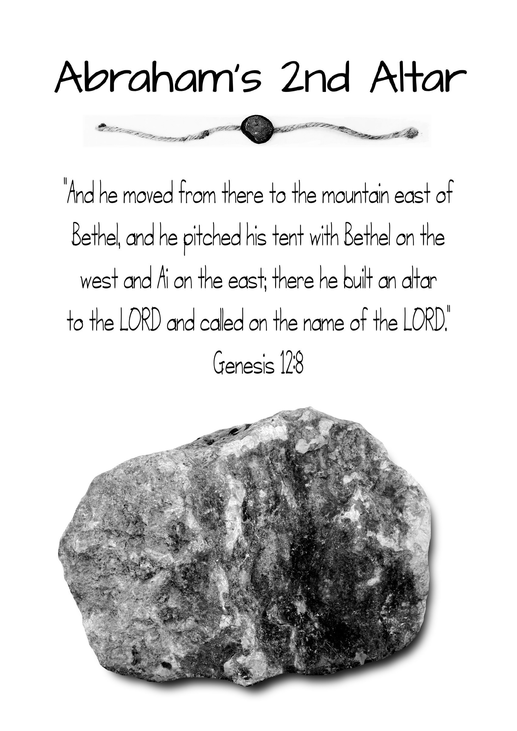 Consult the map in your Bible to find the places Abraham traveled to, and draw with colored markers on your own map a dotted line of his travels, coming down from (Haran), then to Shechem, then Bethel, and then a dotted line going south and west toward Egypt. Draw hills to show the hill country. Put dots where the cities were. Also, draw little illustrations of the altar that Abraham built at Shechem. If you have the journal book for this study there is a map on page 197 that you can use. Make a sticky-note of all the details of the altar and stick it next to your illustration.