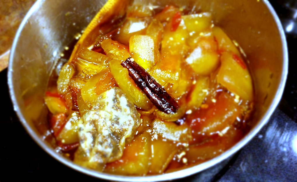 Add the sugar, Garam Masala, ginger, vinegar, salt, and honey, half-cover the pan with a lid and cook over a low heat for about 20 minutes.